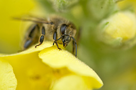 Honigbiene auf Blüte. Die Anzahl der Bienenvölker nimmt in Mitteleuropa und USA ab. Dies hat potentielle Auswirkungen auf die Bestäubung von Feldfrüchten.