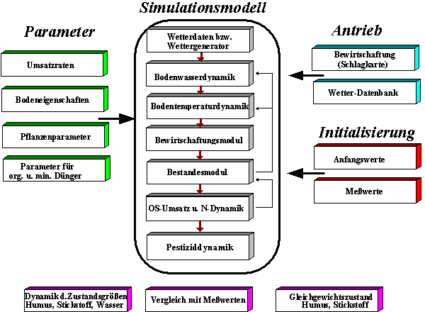 Das Bodenprozeßmodell CANDY besteht aus 5 Komponenten. Die folgende Abbildung verdeutlicht den Aufbau des Simulationsmodells.