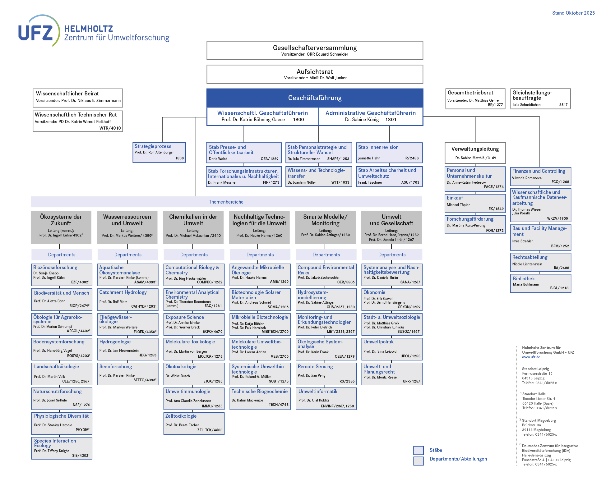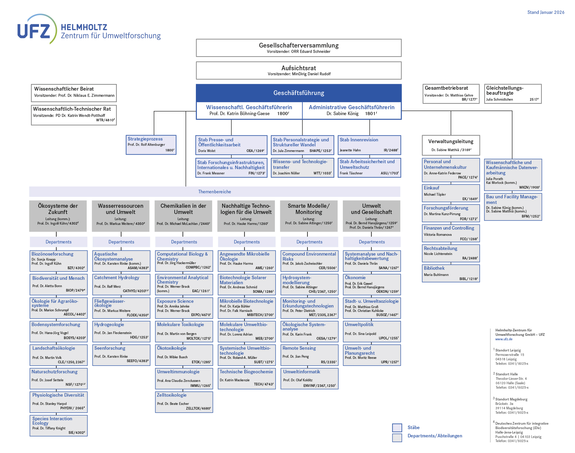 Das Organigramm des UFZ gibt Ihnen einen Überblick über die wissenschaftliche und administrative Organisationsstruktur, wichtige Ansprechpartner, Gremien sowie Beauftragte.