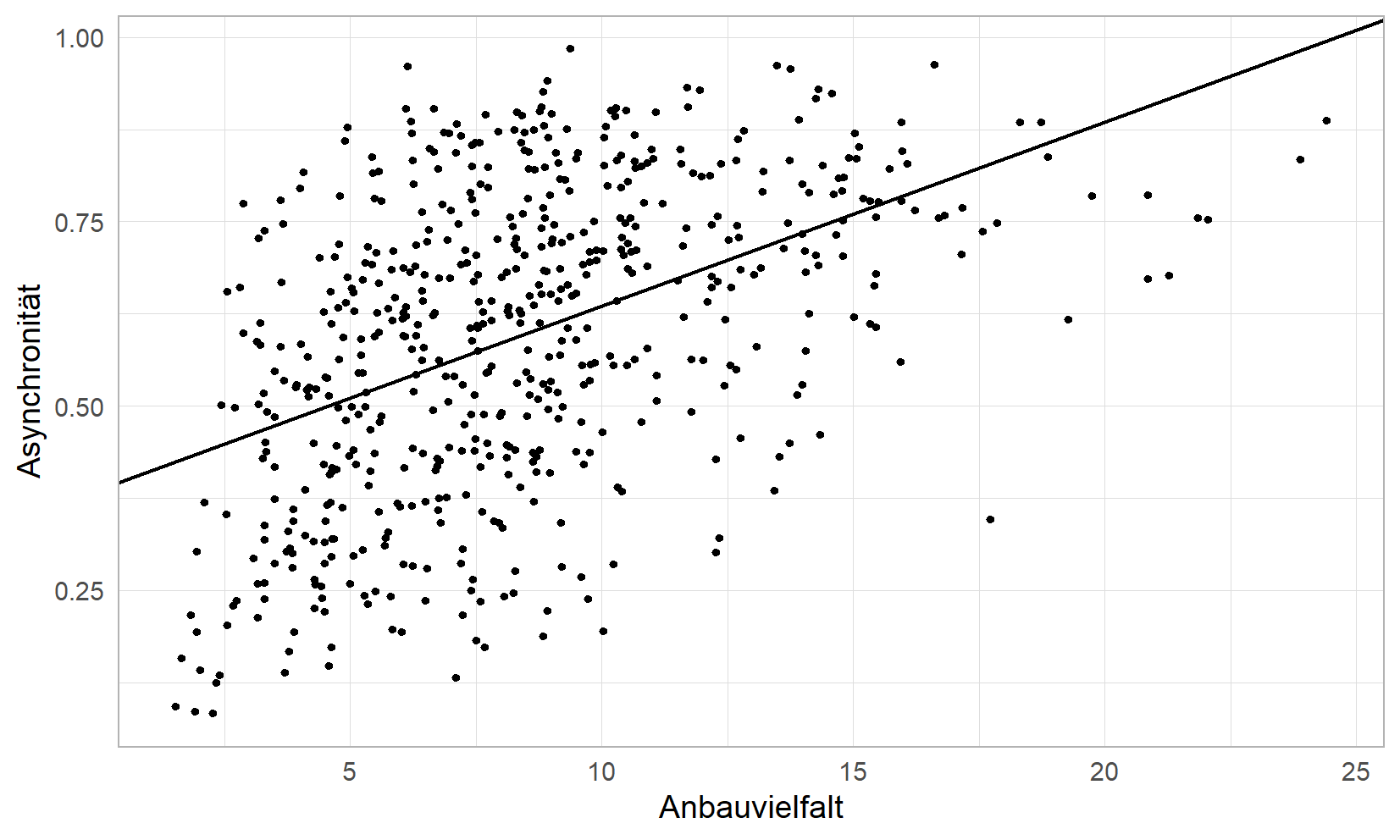 Zur Erhöhung der Ernährungssicherheit ist es wichtig, dass es nicht gleichzeitig zu Produktionsverlusten mehrerer Kulturen kommt, diese also möglichst asynchron sind (Mehrabi & Ramankutty 2019). Eine höhere Diversität von Agrarkulturen wirkt sich positiv auf Asynchronität aus, insbesondere wenn die angebauten Kulturen unterschiedlich auf verschiedene Bedingungen reagieren (Egli et al. 2020, Egli et al. 2021).