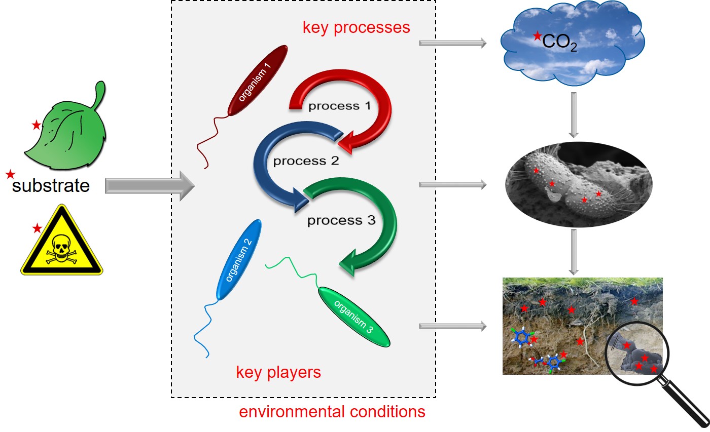 We apply isotope labelling to trace the fate of selected compounds and to set up mass balances including information about the contribution of biomass components to soil organic matter and the formation of non-extractable residues. We also consider energetic aspects of biological compound transformation. General focus of the experiments is to identify key processes and to link microbial activity to energetics and stoichiometry of degradation and turnover processes. Overall, we aim to provide options for sustainable management of soils and sediments for safeguarding ecosystem functioning.