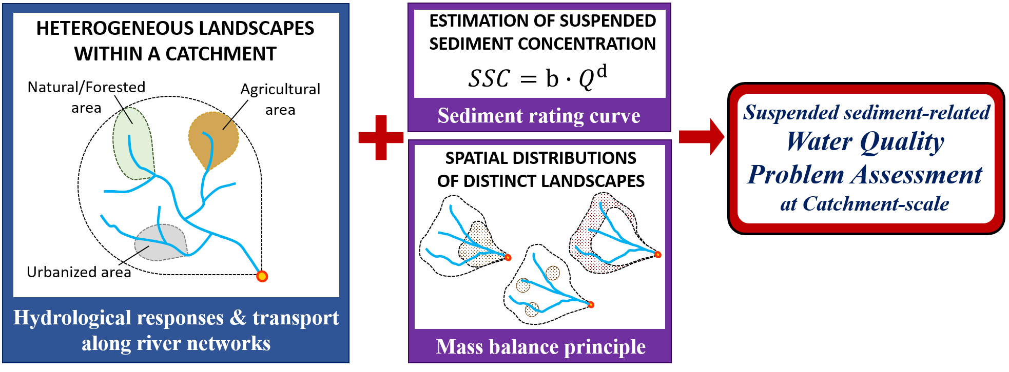 Suspended sediments in river reaches are broadly perceived as water quality pollutants. Human-altered landscapes such as agricultural and urbanized areas increasingly contribute to the environmental threats from suspended sediment loads in rivers. However, integrated effects of natural-agricultural-urbanized landscapes within a catchment on suspended sediment-related water quality problems are poorly understood. To this end, systematic differentiation for suspended sediment export regimes from different landscapes, archetypal approaches for spatial distributions of diverse landscapes in a given catchment, and a hydrological model framework at the scale of an entire river network are required.