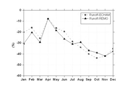 Increasing temperatures in the future lead to a reduced percentage of snow (Tab. 1). Together with higher wind speeds and a higher solar irradiation SWAT simulates a higher potential evapotranspiration throughout the entire year for the RCM REMO input, whereas for the GCM ECHAM an increase in summer and autumn is simulated (Tab. 1 and Fig. 3). For REMO a considerable rise in actual evapotranspiration was modeled, especially during the winter half year. The low water availability (precipitation) projected by ECHAM caused decreasing actual evapotranspiration rates. There are large differences between eva-potranspiration and potential evapotranspiration in summer, what means that plants will suffer from water stress.